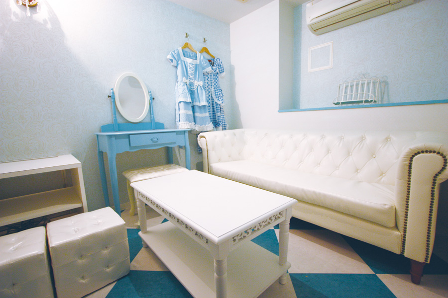 こちらは白と水色を基調としたお部屋です。かわいい白のソファーに座ればカワイイお洋服もさらにかわいくなりそう♡