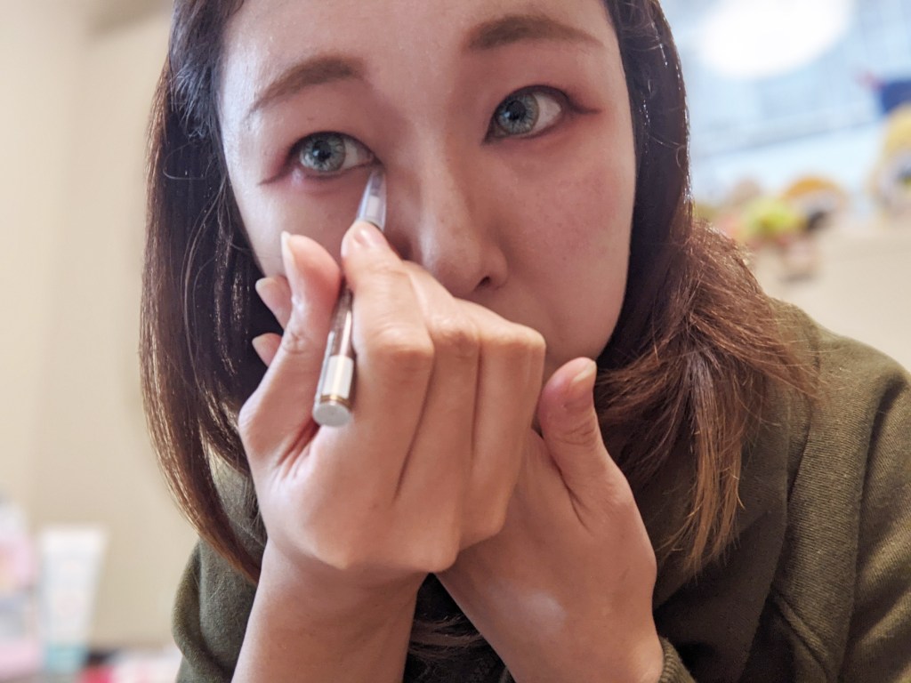 まつ毛の際だけでなく、瞼を少し上に引っ張って”書く”というより”塗って”いきます。