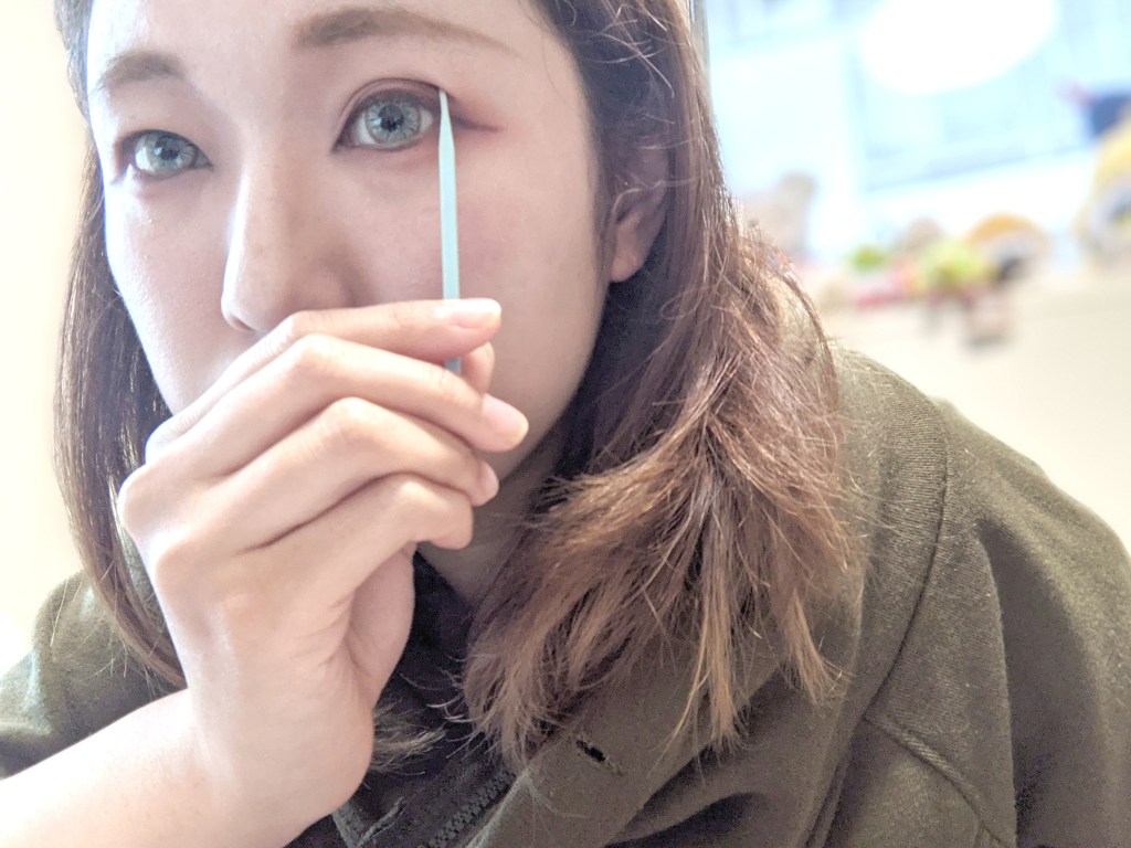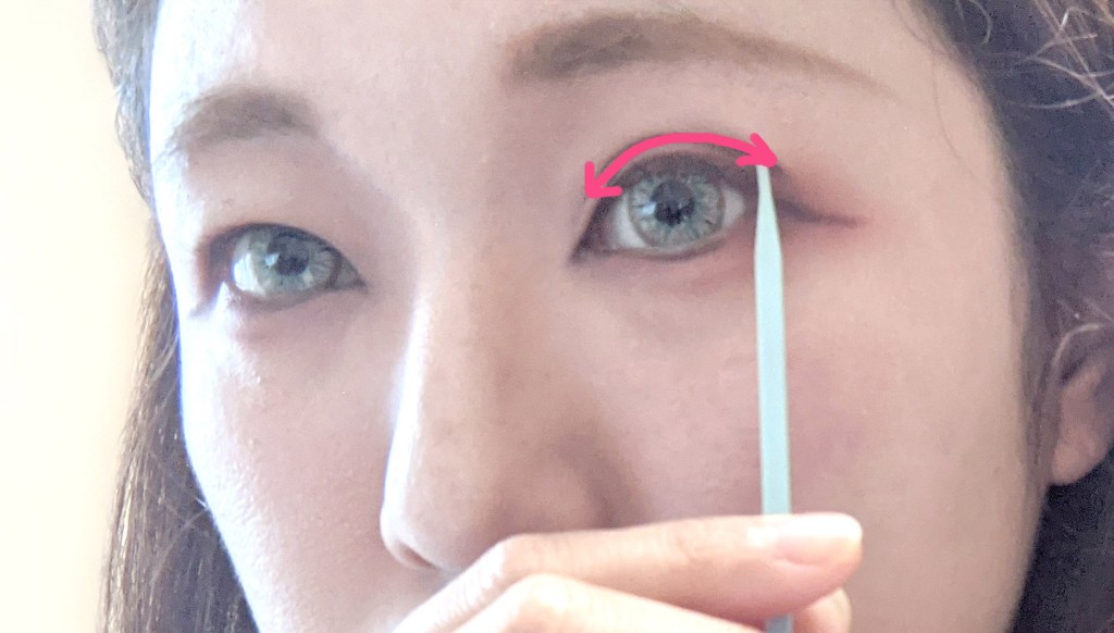 上の画像みたいに細い棒で瞼を押し上げると擬似的に二重ができるので、これで理想の幅を見つけておくんですが…
