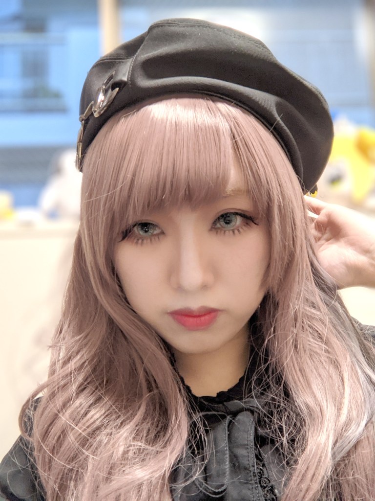 ウィッグって頭のてっぺんがちょっと浮いて不自然に見えるので、ウィッグ被ったらカチューシャや帽子被るといい感じになります。